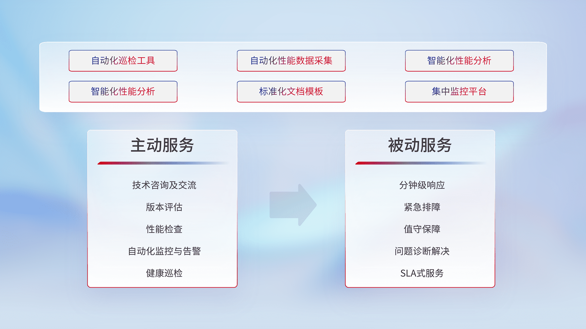 智能化工具和标准化文档,,,,保障服务质量,,,,提供主动服务(包含技术咨询、、、、版本评估、、、性能检查、、、、自动化监控与告警、、、健康巡检)和被动服务包含(分钟级响应、、紧急排障、、、、值守保障、、问题诊断解决、、、SLA服务)。。